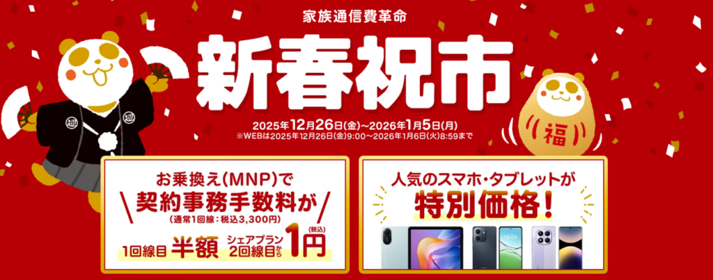 また1月5日までは「新春祝市」開催中で、乗り換え契約事務手数料が一回線目半額、シェアプラン二回線目で1円です。