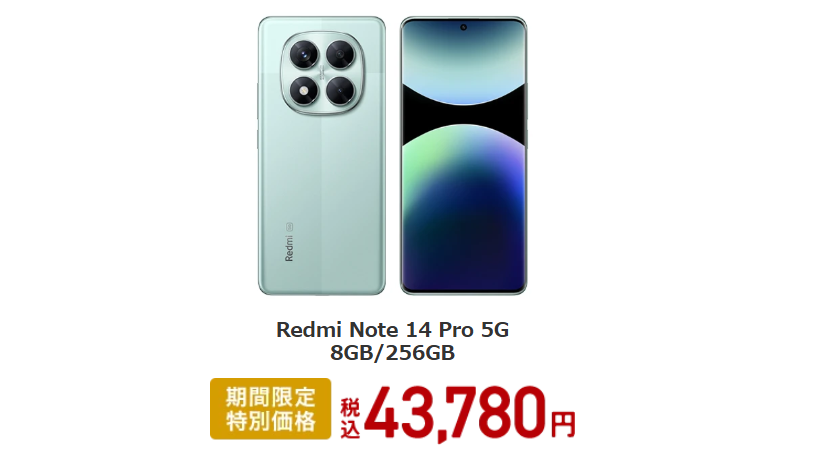 | Redmi Note 14 Pro 5G 8GB/256GB | 43,780円 |