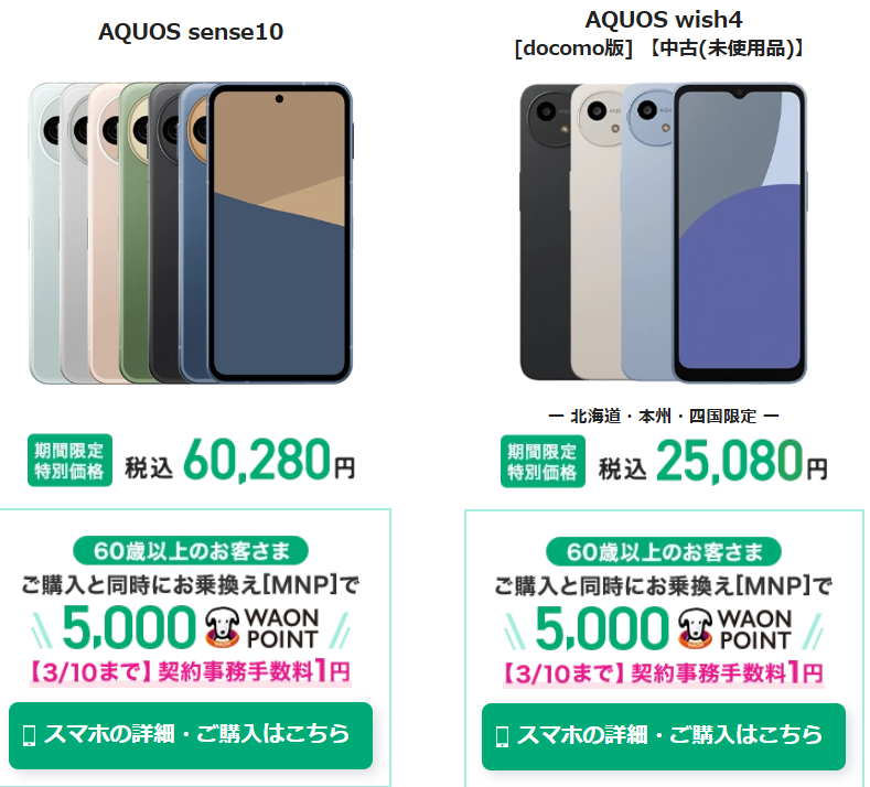 | AQUOS sense10 | 60,280円(特別価格) | 全店舗対象 |