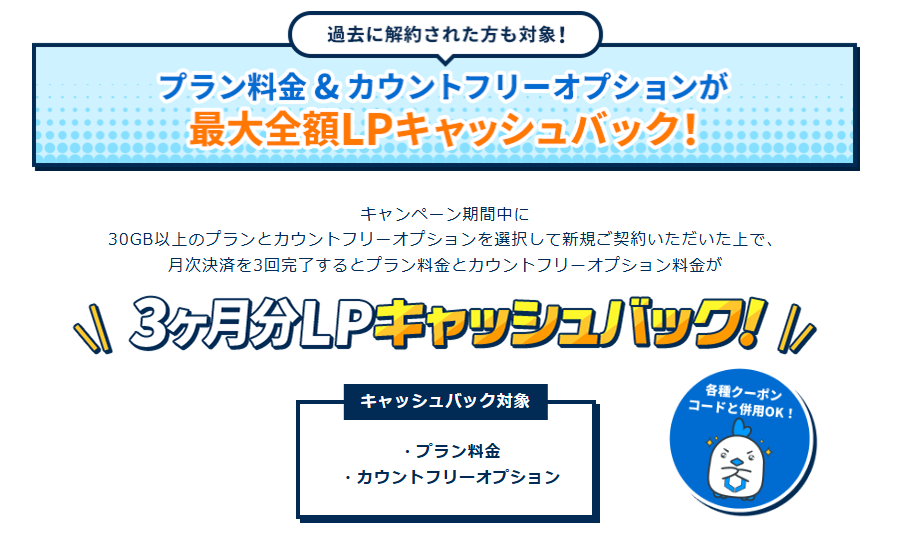 キャンペーン期間中に30GB以上のプランとカウントフリーオプションを選択して新規契約後、決済を3回完了するとプラン料金とカウントフリーオプション料金が最大三か月分キャッシュバックされます