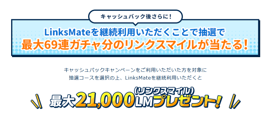 上記キャッシュバックキャンペーン利用者対象に抽選コースを選択の上、LinksMateを継続利用で応募できます