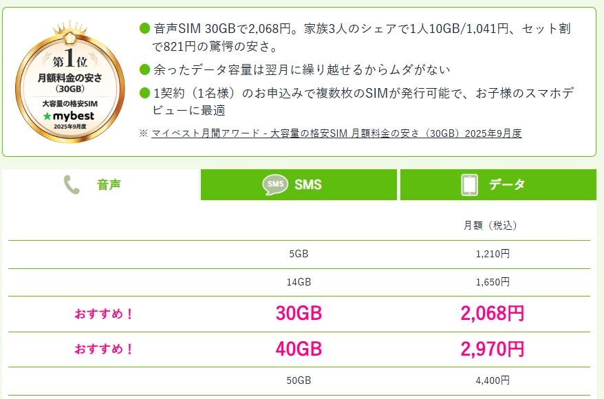ガチ使いの場合も複数回線(最大5枚)でデータシェアができるので、家族利用や複数デバイスを持つ場合も経済的です、三人家族で10GBを1,041円で使えるならかなりあり