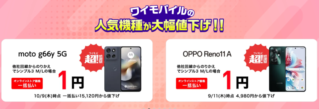 ワイモバイルから一括1円機種が追加されてます、対象機種はPPO reno11A、moto g66y5gの2機種が追加されました。