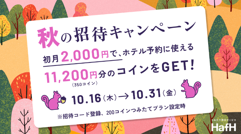 僕も常用しているホテル宿泊の積立サービス「Hafh」から「秋の招待キャンペーン」として、手出し2,000円で11,200円分のコイン(350コイン)がもらえるキャンペーンを実施中です。