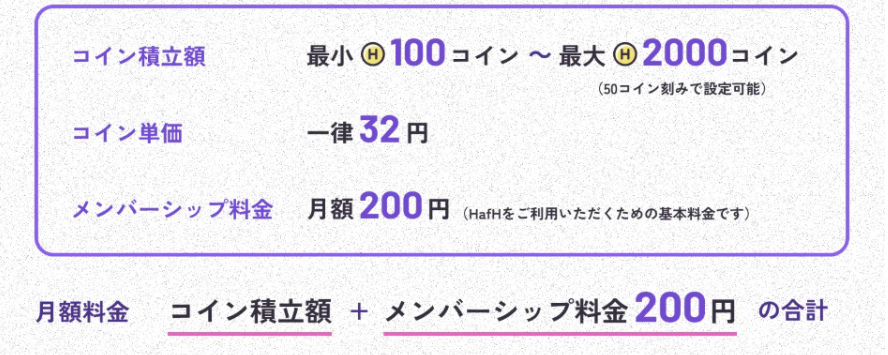 2025年8月1日から、HafHは「ウォレット機能」をリリースし、月ごとにコインの積立額が100コイン~2000コインまで自分で設定できるようになりました。