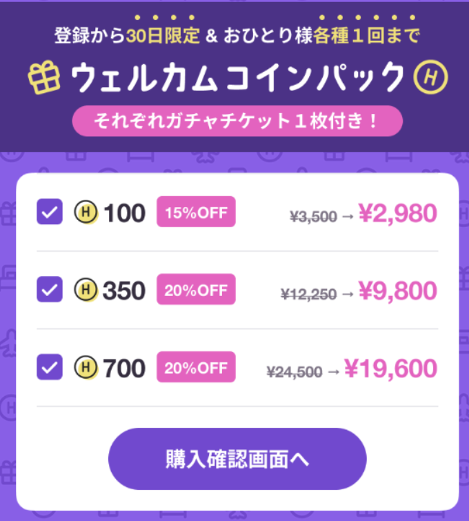 そして新規契約者を対象にウェルカムコインパックを発売されます、最大20%オフで購入出来ます