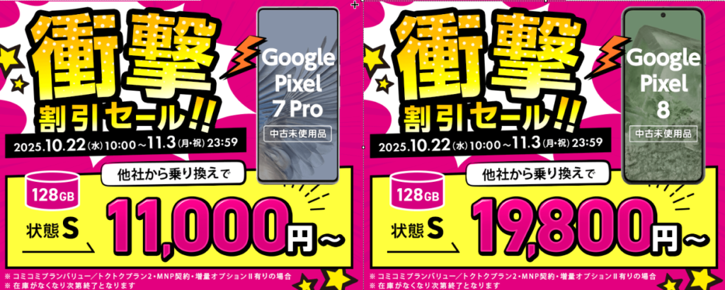 ゲオモバイルが「衝撃割引セール」を開催中、他社からの乗り換え(MNP)で、Pixel7proが11,000円、Pixel8が19,800円~共に状態S、状態Sは中古品ながら未使用品なのでバッテリーなどは問題なし