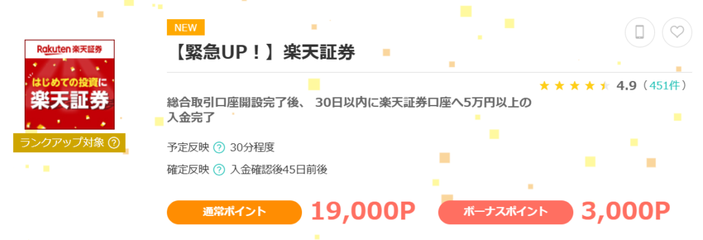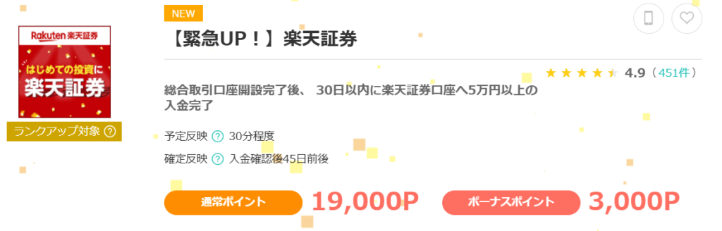 モッピー経由で楽天証券口座開設後、30日以内に楽天証券口座へ5万円以上の入金完了で19,000ポイント+チャレンジボーナス3,000ポイント=合計22,000ポイントが還元されます、過去最高クラス