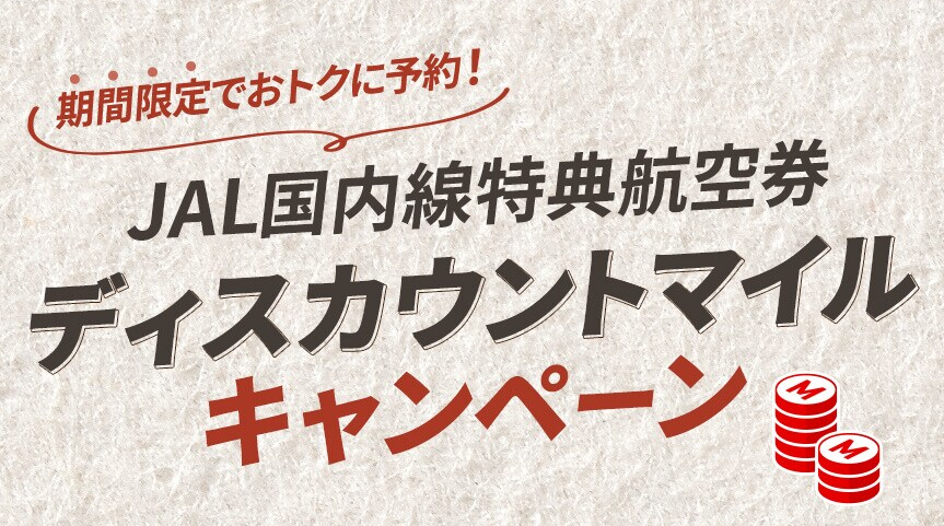 JALから国内線特典航空券ディスカウントマイルキャンペーンが開催されます、期間限定で通常より少ないマイル数で特典航空券を発券出来ます。