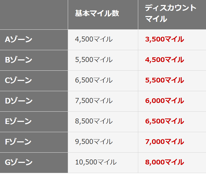 割引は距離毎のゾーンによってわかれます、Fゾーン・Gゾーンが片道2500マイルお得です。