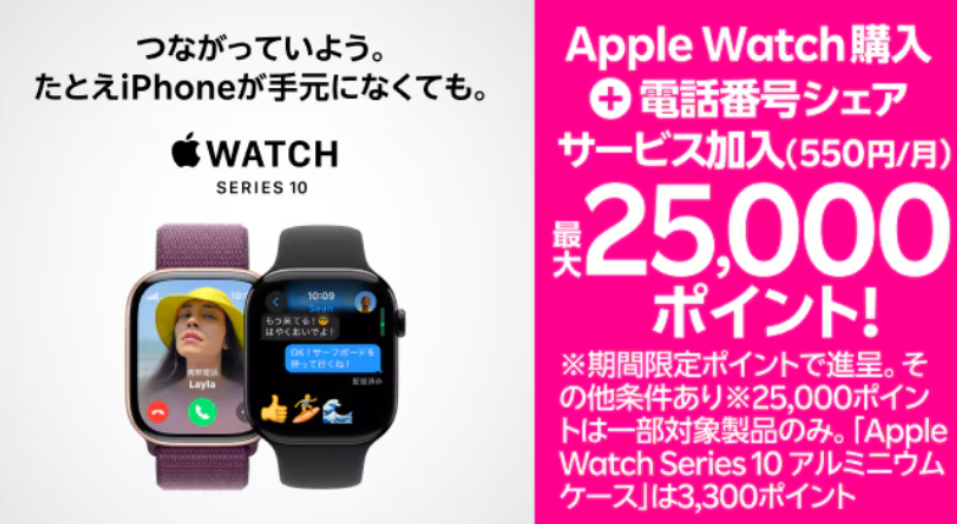 楽天モバイルでは、Apple Watchの対象モデル購入と「電話番号シェアサービス」への加入で最大25,000ポイントがもらえるキャンペーンを実施中です。