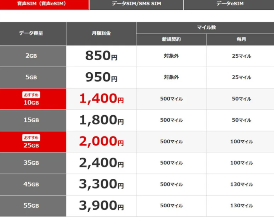 毎月の契約プランによって貯まるマイルは以下の通り、2GB音声プランがコスパ高いです