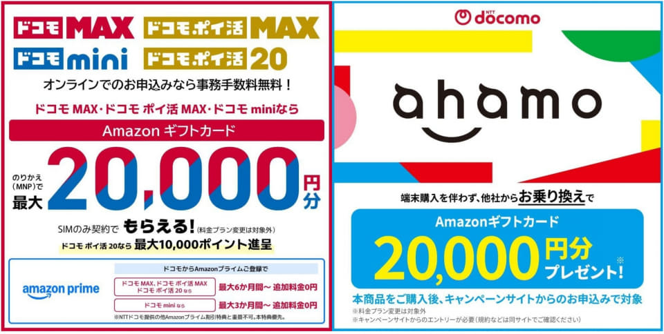 ドコモの「ahamo」「ドコモ MAX」、Amazon経由のMNPなら2万円相当のAmazonギフト券貰える