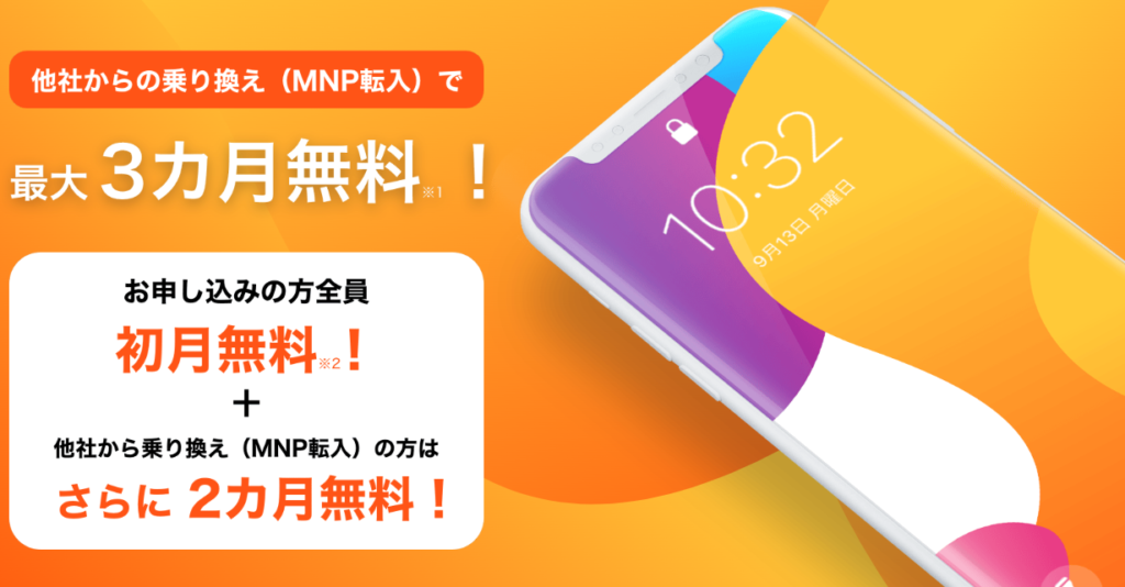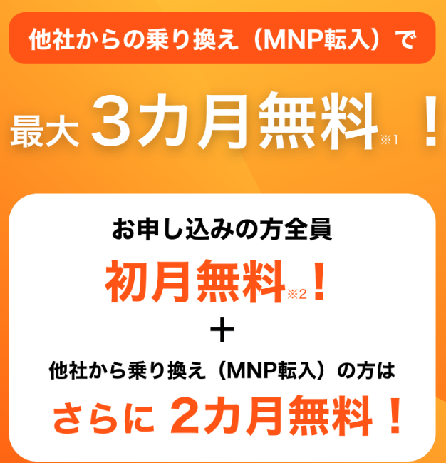 ①全プラン(音声通話SIM)対象で、MNPなら3か月、新規契約なら初月のみ