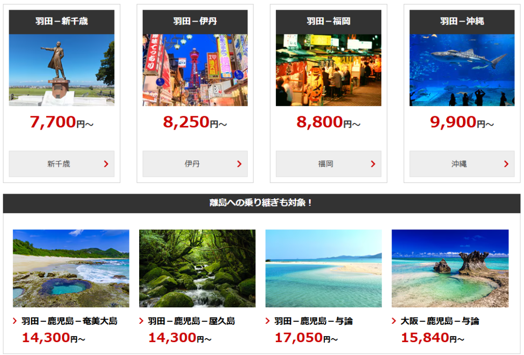 片道最低運賃は、東京/羽田〜札幌/千歳線が7,700円、東京/羽田〜大阪/伊丹線が8,250円、東京/羽田〜福岡線が8,800円、東京/羽田〜沖縄/那覇線が9,900円、主な路線は以下の通り、これ以外も安いです。