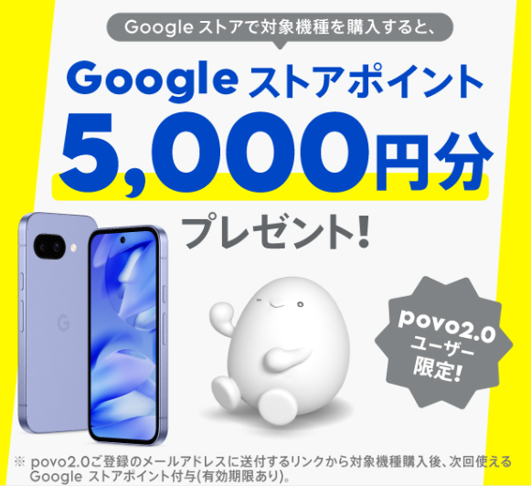 今回新たな試みとして、povo2.0ユーザーは対象製品購入で追加5,000円分のGoogleストアポイントが付与される特典が追加