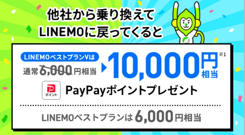 還元額がLINEMOベストプランVが10,000円分、LINEMOベストプランが6,000円、容量が少なくてもOKな人はLINEMOベストプランに乗り換えも手
