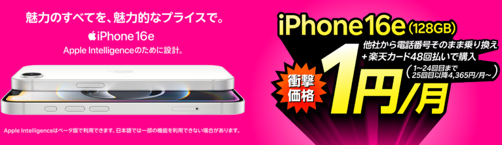 楽天モバイルからiPhone16e(128GB)が、月々1円~利用可能です。条件は以前は新規からでもOKでしたが今回はちょっと厳しめで以下条件が追加されます。