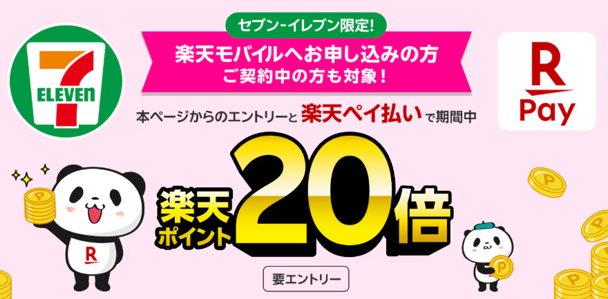 楽天モバイル利用者限定、楽天ペイ払い20倍還元キャンペーンを実施中です。ただしセブンイレブン限定