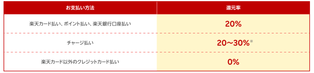注意点としては楽天カード以外のクレジットカード払いにするとそもそも0%なので還元は無し