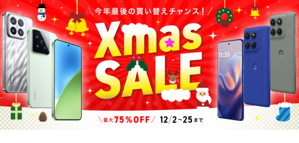 IIJmioのクリスマスセール2025が開催中です、セール期間は12月25日まで開催、MNP特価ではなく端末単体購入でも最大75%オフの特別価格が適用されてます。