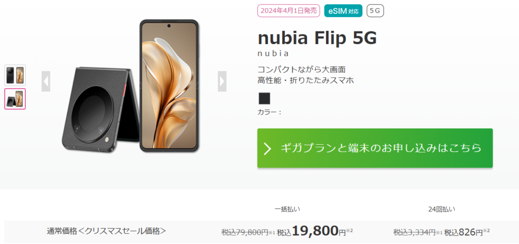 格安折りたたみスマホの「nubia Flip 5G」などは、税込79,800円→19,800円と見た目の割引率は凄い、メモリも8GBあるのでゲームなど以外はサクサク動きます、そしてなんとオサイフケータイ付