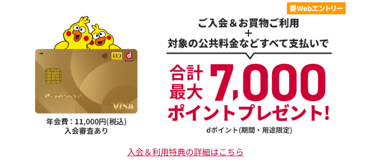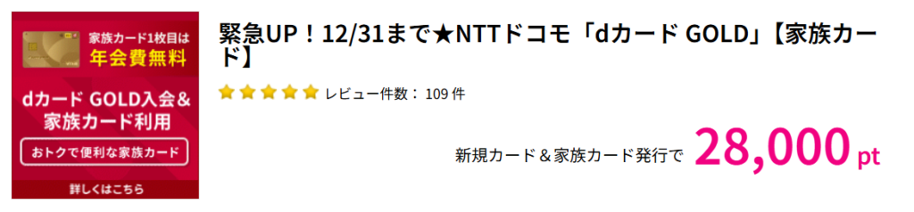dカードゴールドカード発行が現在激熱です、年会費は11,000円かかりますが合計で32,000円還元になり、プラス21,000円プラス、また家族カード同時発行は更に+3000円の28,000円還元、合計35,000円還元