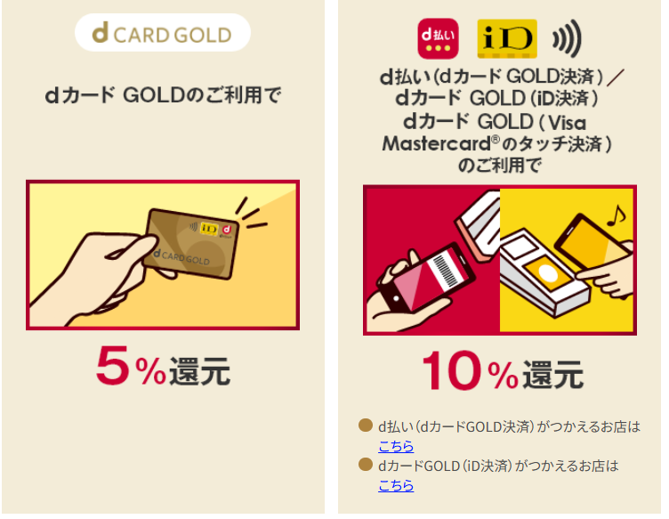 基本還元1%に加えて、カード利用で5%還元、d払いやiD払いなら10%還元です。