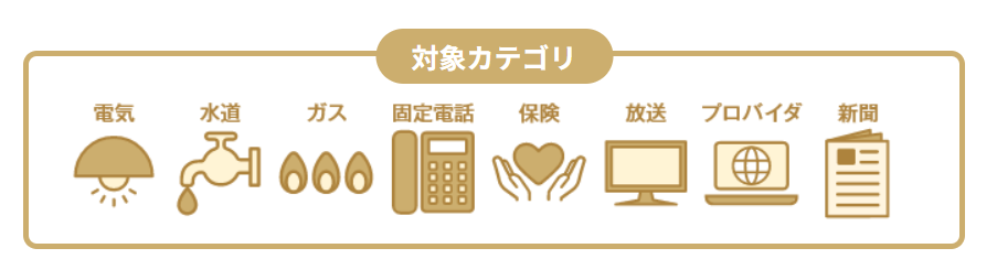 カテゴリーは電気、ガス、水道、固定電話、放送、インターネット・プロバイダ、新聞、保険の8つ