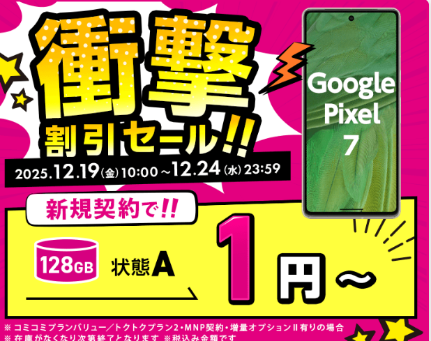ゲオモバイルでGoogle Pixel7の割引セールが開催中です、期間は12/19~12/24、新規契約で状態Aのものが1円で販売中。
