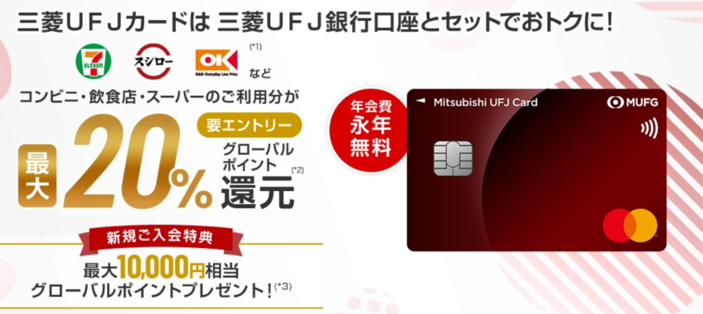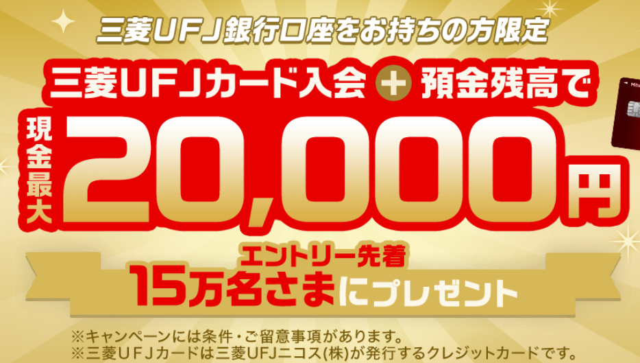 三菱UFJ銀行持ってる人限定、三菱カードに入会&20万円以上保有で現金2万円が貰える、最大還元46,000円分還元