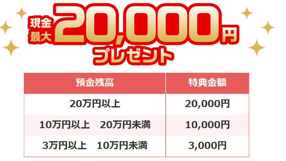 残高に応じて還元されます、ここは20万以上の残高一択、そもそも入っている人は追加の必要はありません。