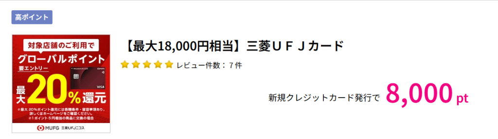 ②三菱UFJカード(年会費無料)ハピタス経由で8,000円還元
