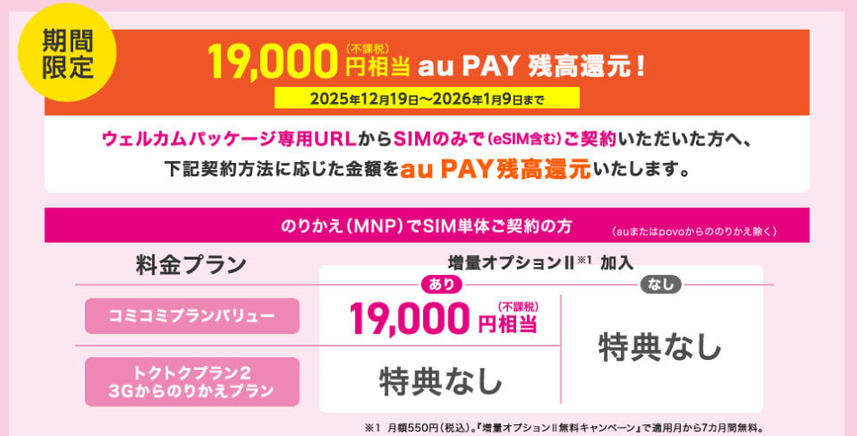 Amazonで現在「UQ mobile」SIMを契約すると進呈されるau PAY残高が、1万9000円相当に増額中です。期間は2026年1月9日まで。