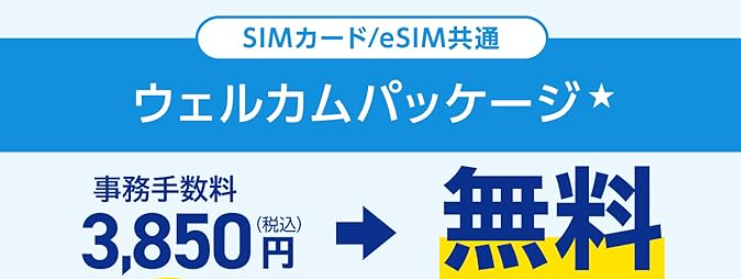 UQ mobile SIM単体ウェルカムパッケージを購入し、契約すると通常3,850円かかる契約事務手数料が無料となる。ウェルカムパッケージの価格は350円。