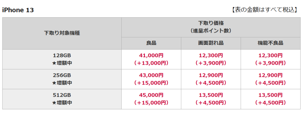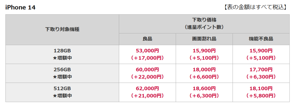下取り用としても優秀です、ちなみにドコモのiPhone14、13の下取り価格は以下の通り