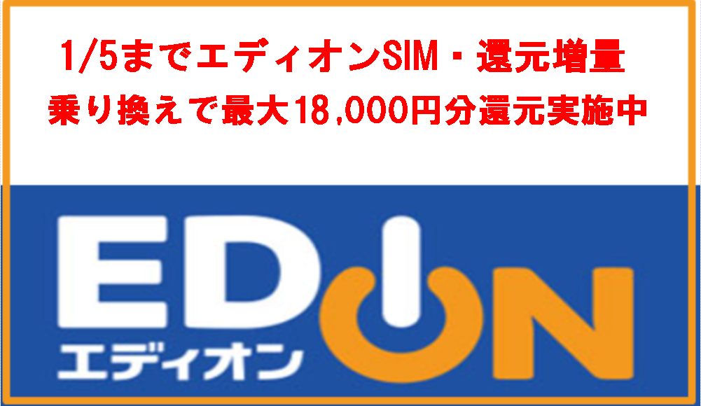 家電量販店のエディオンの運営する「エディオンsim」が、MNP(番号そのまま乗り換え)で最大18,000ポイント還元中です、月初は最大16,000ポイント還元でしたが、1/5まで還元増量です。