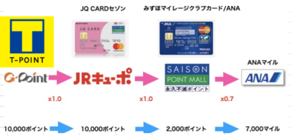 現在「ポイントサイト → Vポイント(またはGポイント等) → JRキューポ → 永久不滅ポイント → ANAマイル、という多段ルートの最終出口としてみずほカードが機能し、実質70%レートを実現してきました