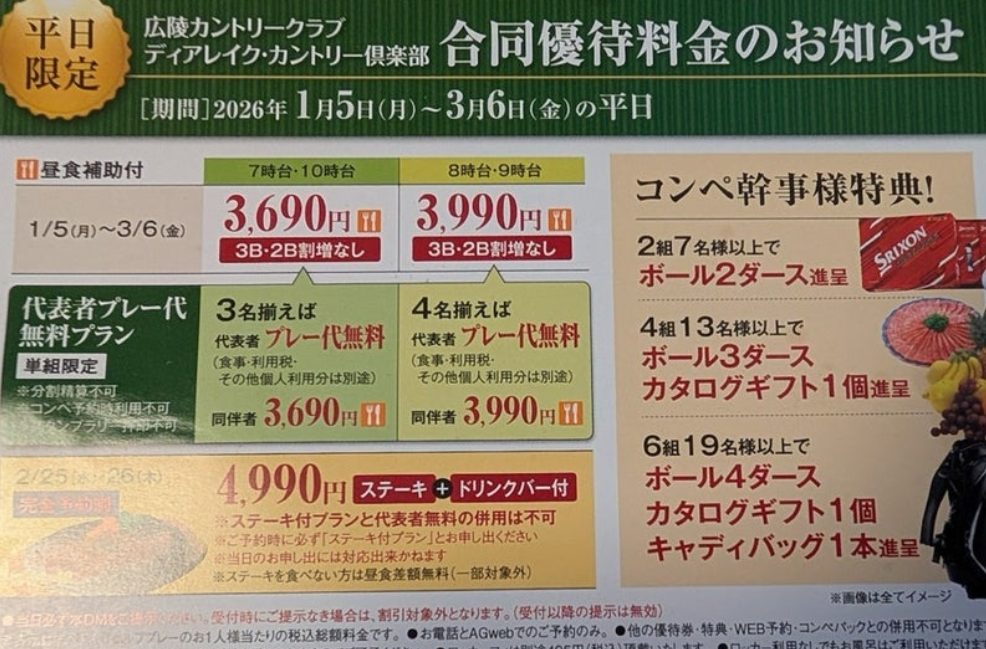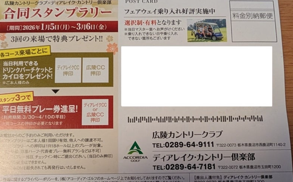 今回ディアレイクCCはスタンプラリーを実施していて、広陵CCも含めて3ラウンドすると1ラウンド無料になります(平日)、そもそものネット予約よりかなり安いです。