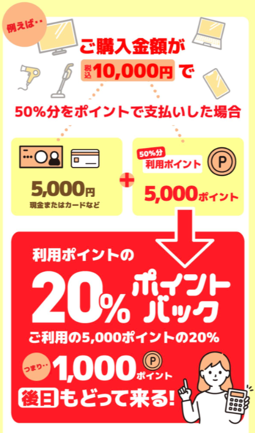 50%を超えて支払いをしてしまうと、その分のポイントはキャンペーン対象外、例えば10万円のお会計だったら50,000ポイントまでポイントで支払うことができて、そうすると20%の10,000ポイントが還元されます。