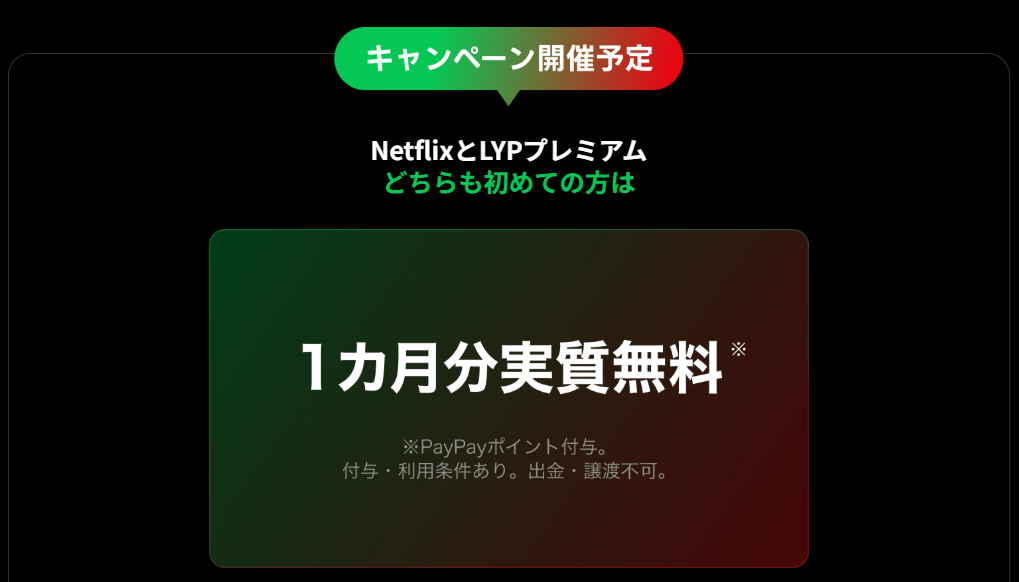 更にLYPプレミアム・Netflix両方初めての人は一か月分実質無料、Netflix単体では初月無料などはないので、これはお得