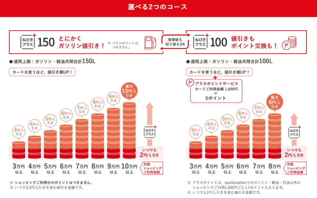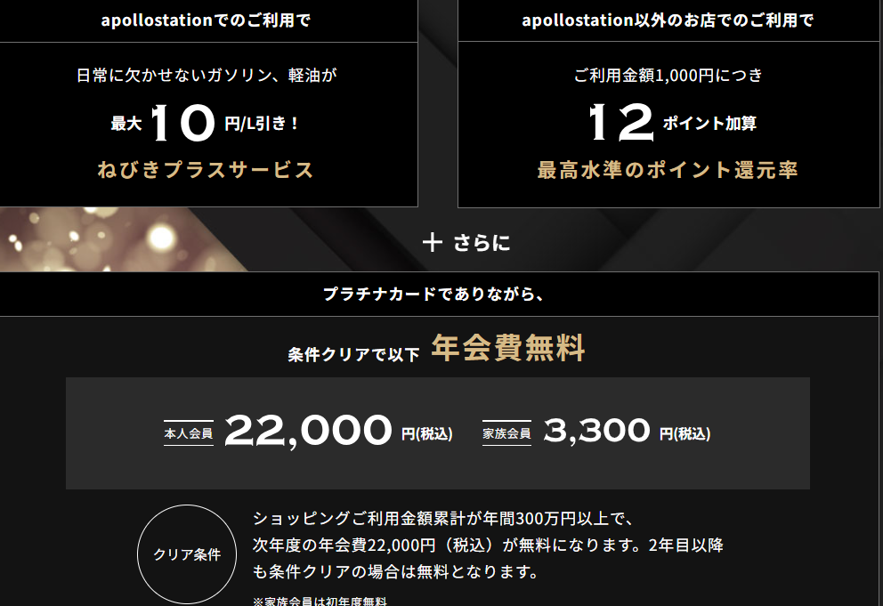 - apollostationや提携店舗でガソリン最大10円引き、他店でも還元率1.2%(ポイント)。ANA/JALマイルへの移行は半分のレート&別途手数料等条件があるため、直接マイル向きではないがdポイント・Ponta等への交換は制限なくできる。