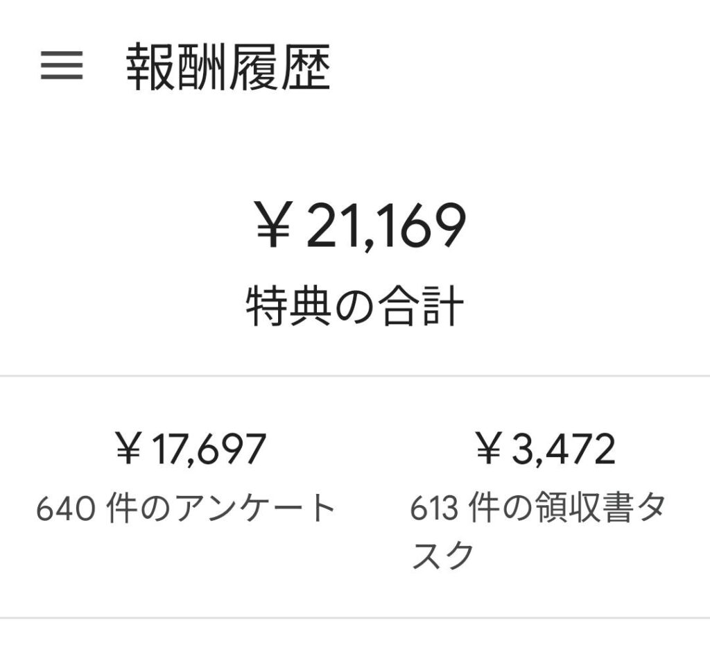 Googleアンケートモニターって知ってますか?アプリをダウンロードしていると2,3日で一回くらいの頻度でアンケート依頼or領収書アップロード依頼が届きます、特に移動頻度が高い人は報酬が高く、運送業をしている友人は2年弱でこれだけ稼いでました。移動頻度が高い人は絶対やった方がいいです。