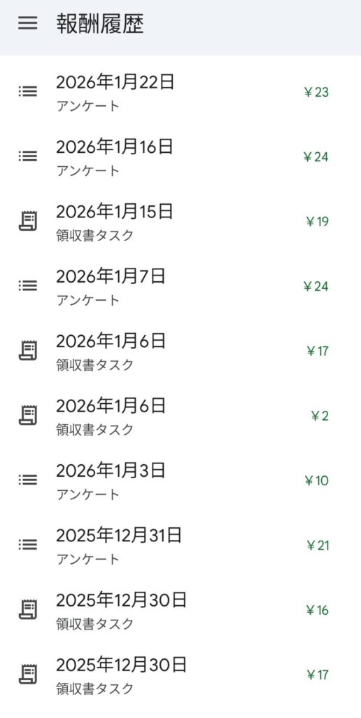 ちょっとしょぼめですが、実際使ってる時間は一個のアンケートで最短10秒、100円のものはGooglepixelに対してのアンケート内容で6問ありました、それでも30秒もかかりません、長ければ長いほど報酬は高くなります