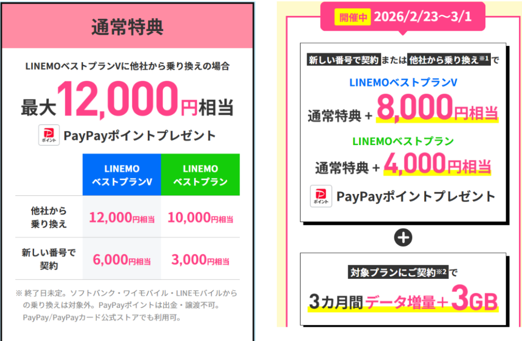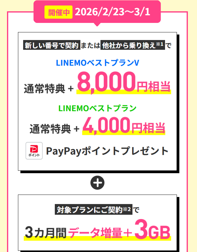 LINEMOの週穫祭キャンペーンで恒例の月末増量です、小容量(3〜10GB)ベストプランに乗り換えると通常10,000円分のPayPayポイント+4,000円=14,000円分が、大容量(30GB)ベストプランVは12,000円分のPayPayポイント+80000円=20,0000円分還元されるキャンペーンが開催中です、しかし今回は事務手数料取られるので注意。