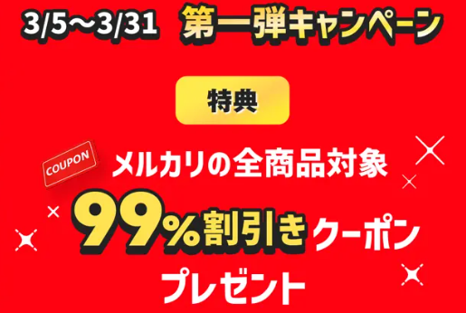 第一弾の目玉は99%クーポンです、メリカリで買い物予定のある人はこちら