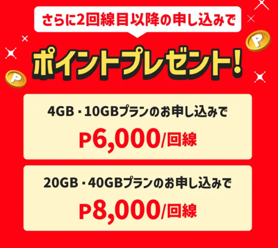 - 複数回線特典(2回線目以降の申込みでポイント付与)。