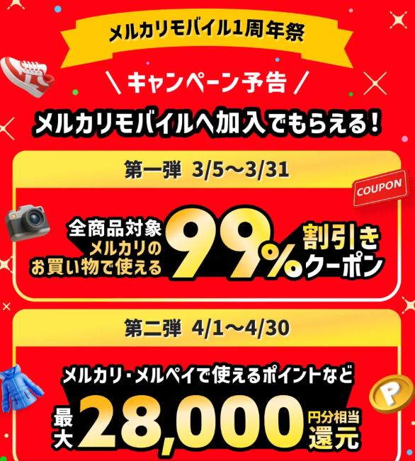 メルカリモバイル一周年祭でメルカリ99%オフ・最大28,000ポイント還元など
