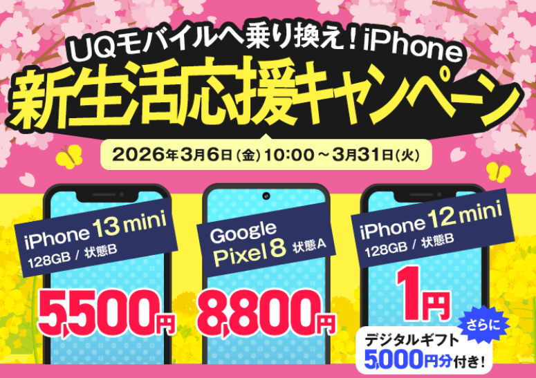ゲオモバイルから新生活応援セール開催中、他社からの乗り換えでGoogle Pixel8,iPhone13mini,iPhone12miniが安い、更にデジタルギフト5000円付き