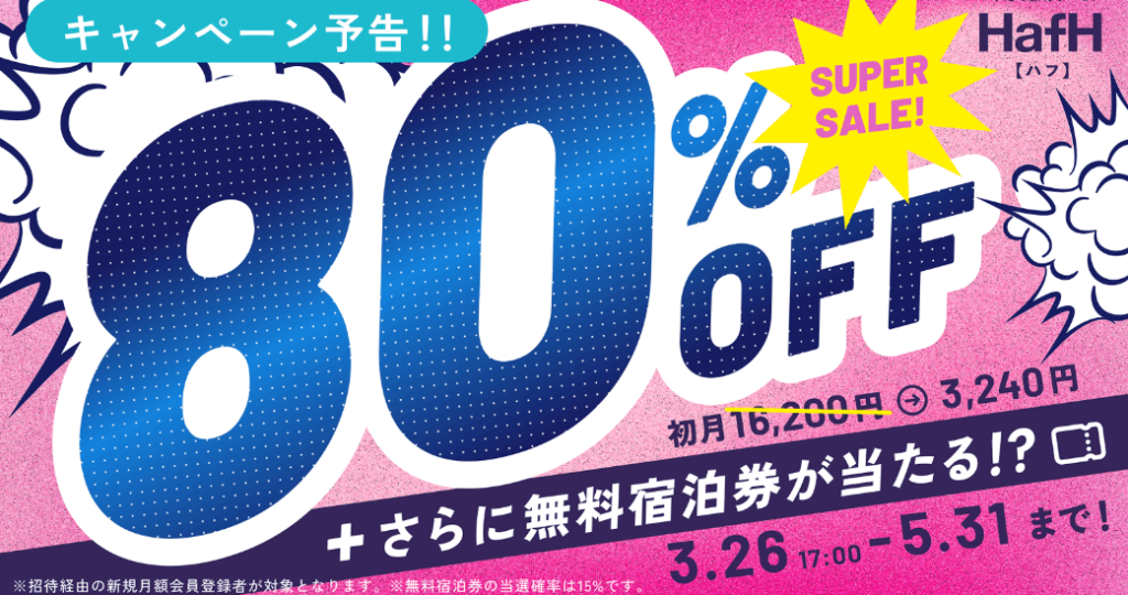 hafh 初月80%オフ+無料宿泊券が当たるキャンペーン